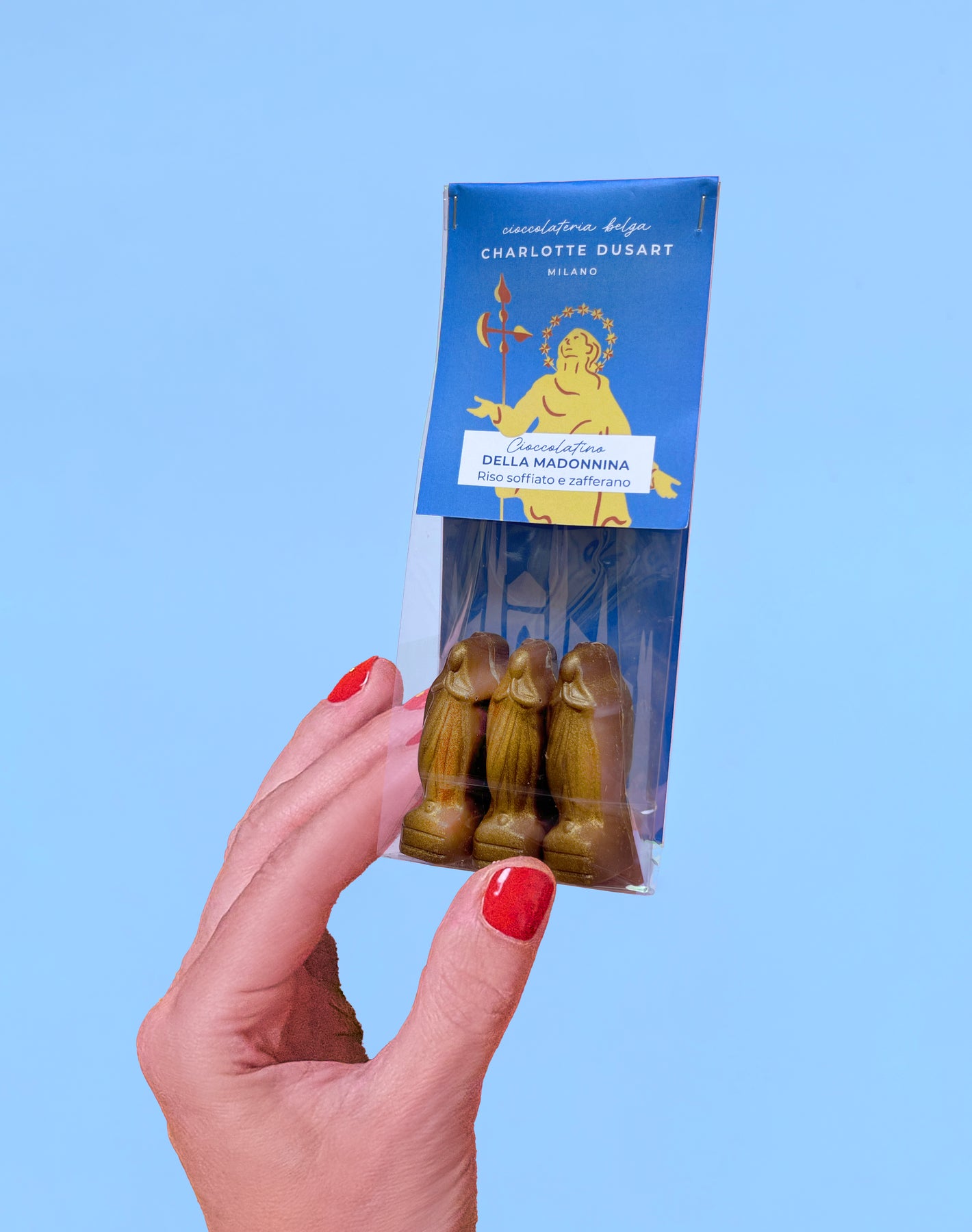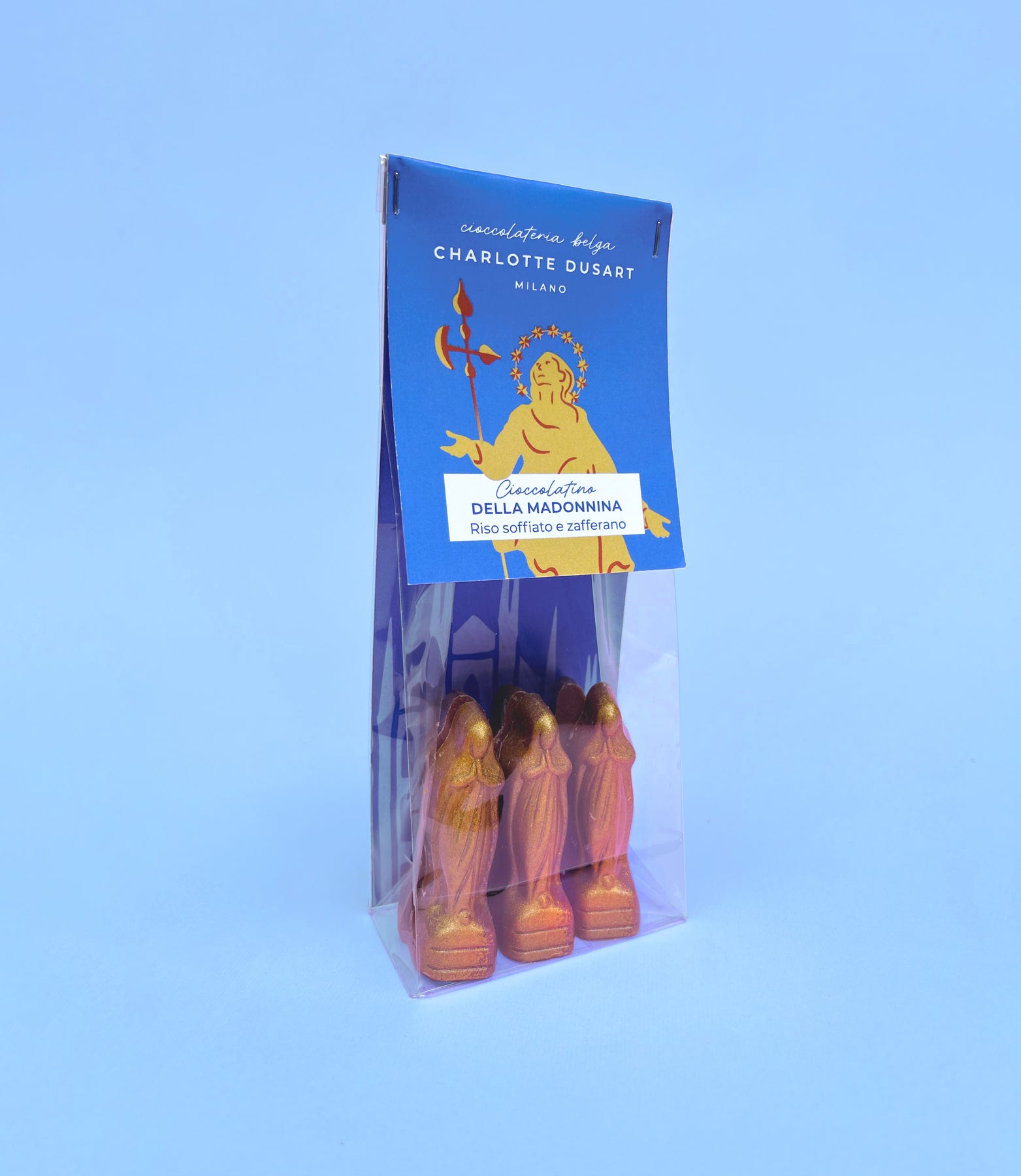 Il cioccolatino della Madonnina è un omaggio a Milano e al suo patrono Sant’Ambrogio, che segna insieme alla Prima della Scala, il vero momento di inizio delle feste natalizie. Il gusto del suo ripieno si ispira dunque al risotto alla milanese, come la Milano Bar.