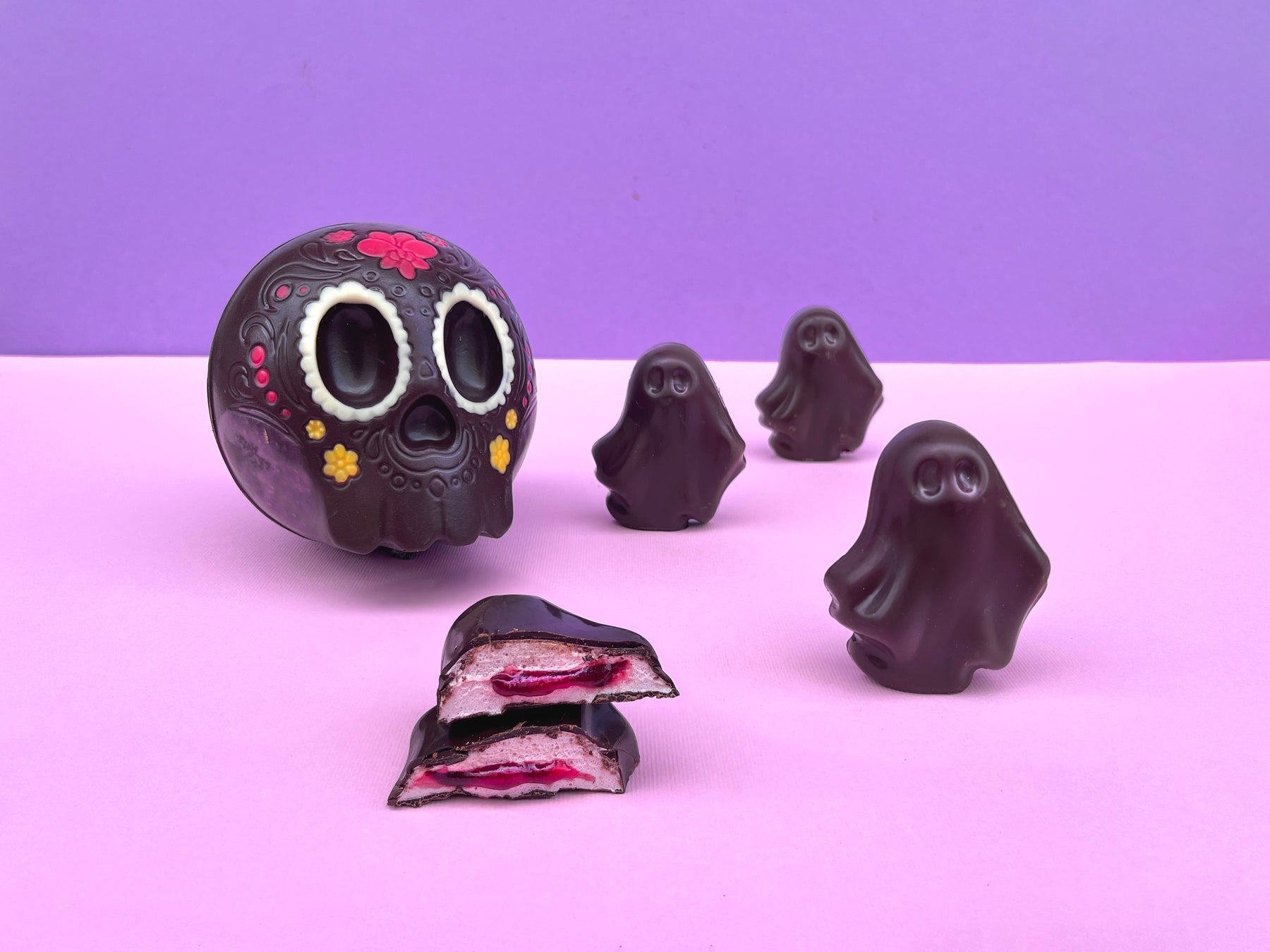 Ma la vera sorpresa si nasconde all’interno: cinque fantasmini con un cuore soffice e goloso di marshmallow alla lampone. Un incontro tenero tra tradizione e fantasia, dove il gusto fruttato del lampone si sposa con la cremosità del cioccolato in un abbraccio irresistibile.