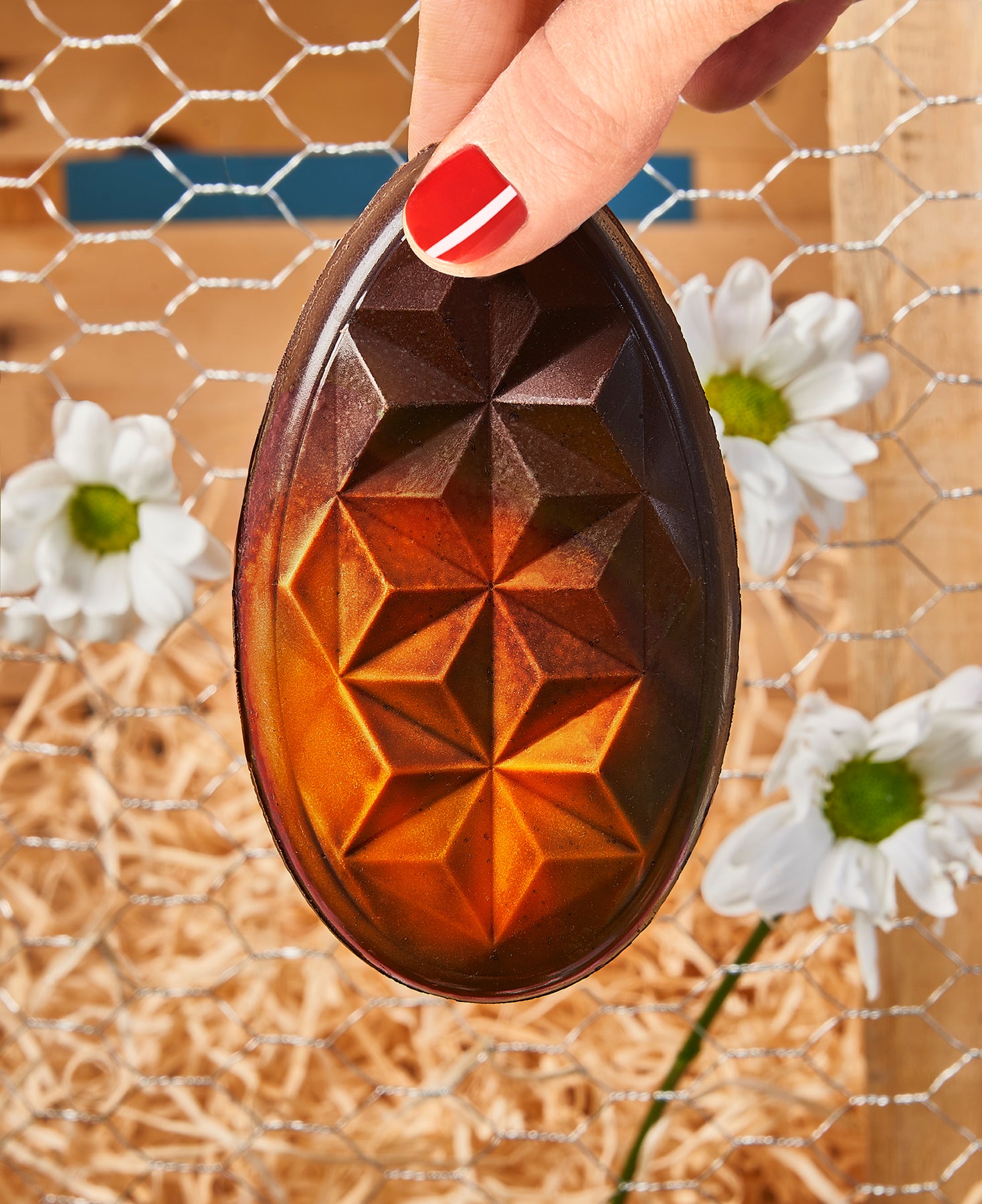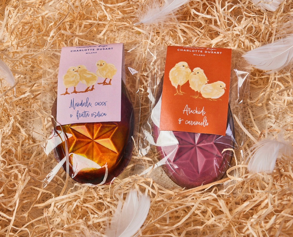 Una tavoletta a forma di uovo confezionata in una busta trasparente con un bellissimo sticker illustrato con i pulcini. Il pensierino perfetto per Pasqua.
